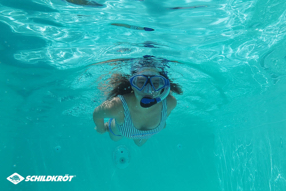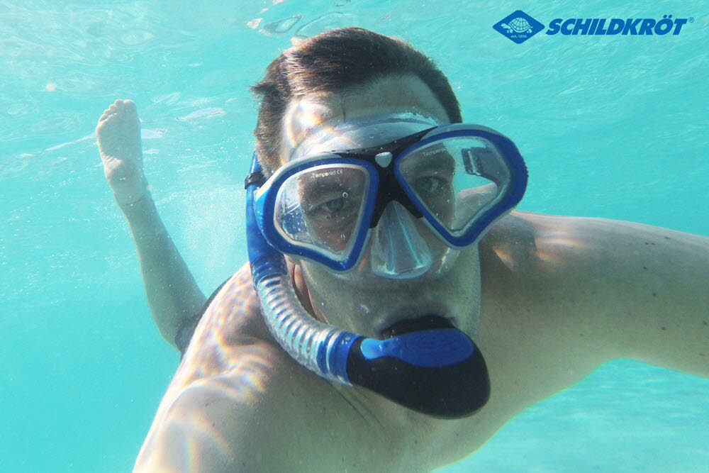 Das neue Pro-Tauchset Palau aus dem Hause Schildkröt besticht durch eine tolle sehr hochwertige Ausstattung, bestes Silikon-Material (gerade beim Schnorchel im Mund ein MUSS!), ein trendiges Design und ein sensationelles Preis-Leistungs-Verhältnis!Der flexibele Schnorchel mit dem beweglichen Easy Clip Halter passt sich super an praktisch jede Kopfform und unterschiedliche Kopfgrößen an! Am oberen Ende ist er mit einem Dry Cap in auffälligem neon-orange ausgestattet. Dieses Ventil verschließt den Schnorchel beim Abtauchen, damit kein Wasser in den Schnorchel gelangt. Die Brille ist aus Sicherheits-Glas und bietet beste Sicht. Die Weitenverstellung des Riemens erfolgt kinderleicht durch zwei seitliche Schallen. Das komplette Set ist im Blister verpackt. Mit dabei ist noch eine Netztasche mit Kordelzug, in die dann alles verpackt werden kann. Somit hat man immer alles praktisch zur Hand. Der vom Schnorcheln nasse Inhalt kann abtrocknen, Sand kann rausrieseln!