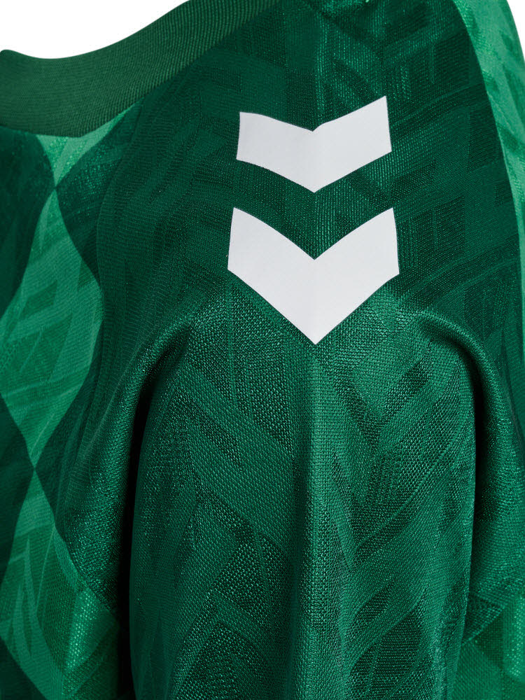 Werder Bremen 24/25 Heimtrikot für Kinder ist mit seinem grafischen Streifenmuster vom Bremer Stadtflagge "Speckflagge" inspiriert. Das Trikot ist in tonalen Grüntönen gehalten, während weiße Details die Seiten und Schultern brechen. Das Trikot besteht aus einem speziellen matten/glänzenden Jacquard-Material, das ihm ein einzigartiges Aussehen verleiht. Das hummel-Logo und das Vereinslogo-Badge sind auf der Brust zentriert. SVW ist im Nackenspiegel des Trikots gedruckt, während der Text „LEBENSLANG GRÜN – WEISS“ auf der Außenseite des Nackens gedruckt ist.