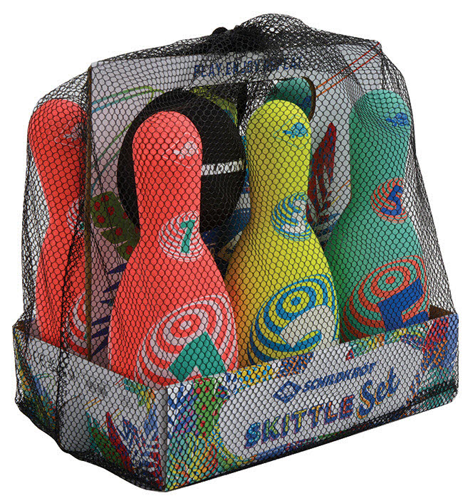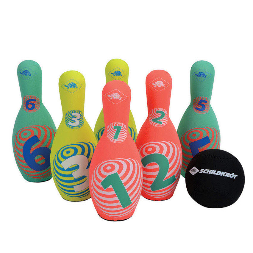 Das sehr beliebte Neopren-Kegelset aus dem Hause Schildkröt im neuen Design ist die spielende Heranführung an das Thema Kegeln. Die leichten, mit griffigem Neopren ummantelten Kegel (21,5 x 8 cm) haben eine ausreichend große Standfläche und stehen gut. Der hohle Kunststoffkern ist ein idealer Kompromiss bzgl. des Gewichtes. Zu leicht, bleiben die Kegel nicht stehen, zu schwer ist es nichts für die Kids! Im Set sind 6 Kegel in 3 verschiedenen Farbstellungen. Mit dabei ist außerdem eine "Kugel" ebenfalls aus Kunststoff und Neopren-ummantelt. Alle Teile passen in die beiliegende, wiederverschließbare Netztasche. So bleibt alles zusammen und man hat beim nächsten Spiel sofort wieder alle Teile zur Hand. Alle Teile sind salzwasserfest; auch einem Spiel am Sandstrand steht also nichts im Wege. Das weiche, leichte, wasserfeste Kegelset ist der ideale Begleiter für Pausenhof, Garten, Wohnzimmer, Schule, Park, Garten. Ideal für Jung und Alt.