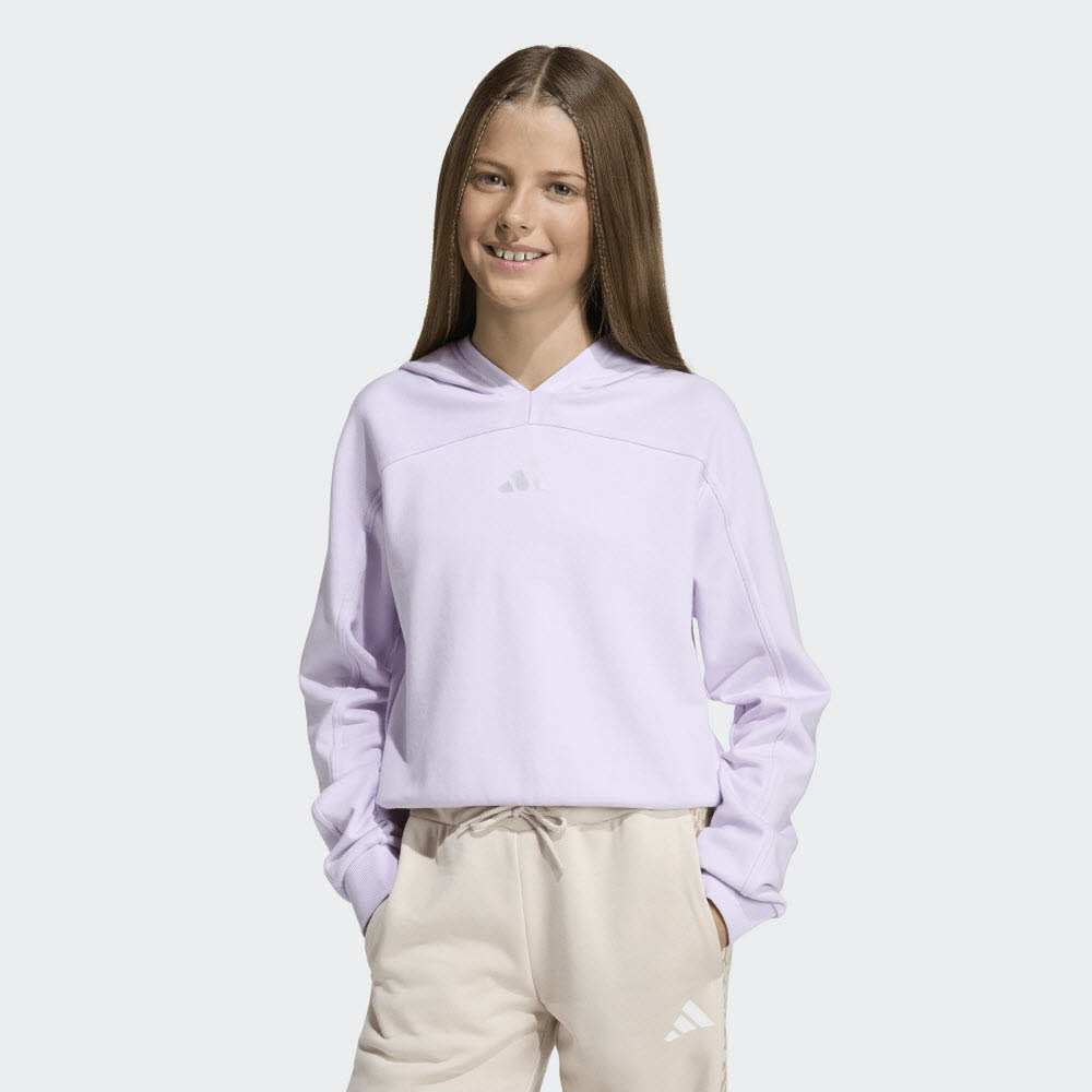 Lebe mit diesem Holiday Glam Cropped Sweatshirt deinen Style aus. Für alle, die sich einen Hauch Glamour in ihrer Alltagsgarderobe wünschen, bietet es mit seiner kürzer geschnittenen Länge und den überlappenden Schnittlinien einen Look, der alle Blicke auf sich zieht. Mit der regulär geschnittenen Passform bietet dieses Sweatshirt genau die richtige Menge an Bewegungsfreiheit, ohne dabei zu locker oder zu eng zu sein. Die kuschelige Kapuze ist ideal, wenn du dich vor der Kälte schützen willst. Das 3-Balken Logo ist auf der Brust in das weiche French Terry eingeprägt und sorgt für adidas-Flair. Egal, ob es sich um einen lässigen Tag oder einen besonderen Anlass handelt, du kannst dich darauf verlassen, dass dieses Oberteil deinen täglichen Abenteuern einen Hauch an Glanz verleiht. 55% Baumwolle/36% Polyester (recycelt) /9% Viskose